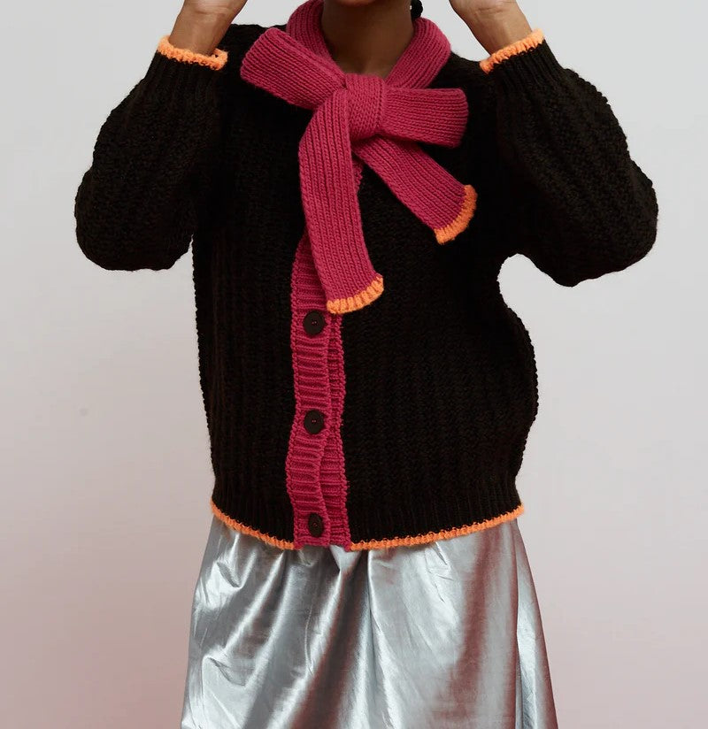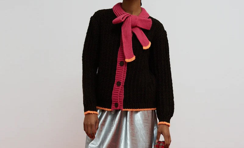 Cárdigan de punto con textura en color marrón. Cuello lazado que aporta un toque divertido y único, en color rosa, y solapa de botones también en rosa a contraste.
