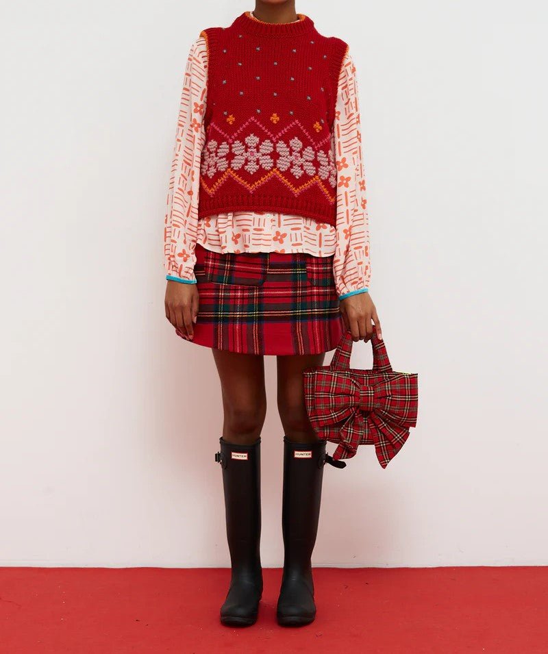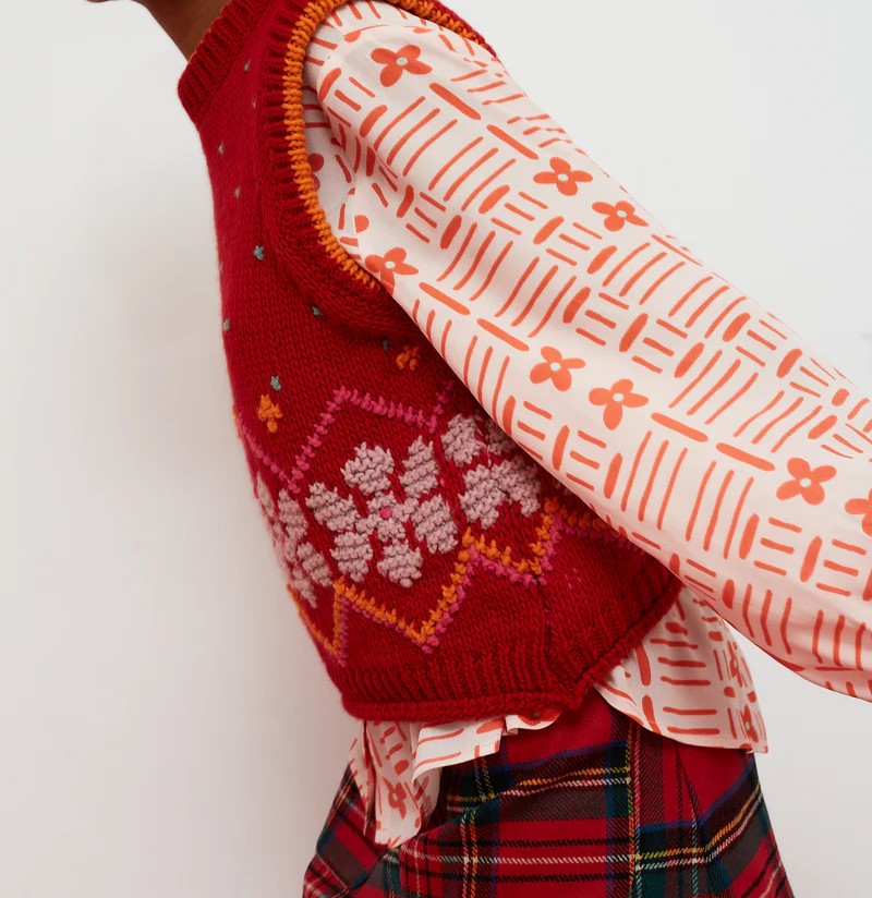 Textura con dibujo de flores naranja puntos azules, copos de nieve en lila, y zig-zag en rosa y naranja, a contraste. Acabado naranja a contraste en cuello redondo y en sisas.